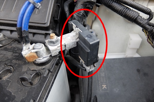 この〇で囲んだセンサーで電圧を監視し、適宜エンジンに負荷をかけぬよう充電しているらしく、センサーより後ろの最初のボディアース箇所あたりにアーシング線を繋ぐ必要があるとの事。