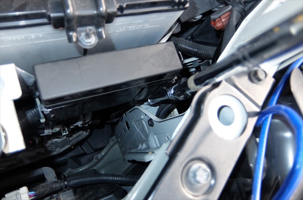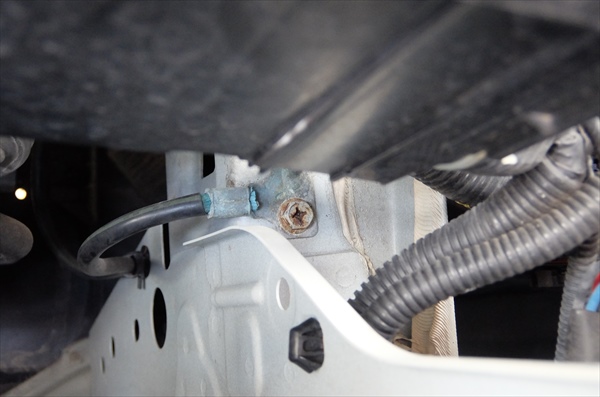 バッテリー下のフレームの少し深いところで、リレーBOXの微妙な影になるところ。