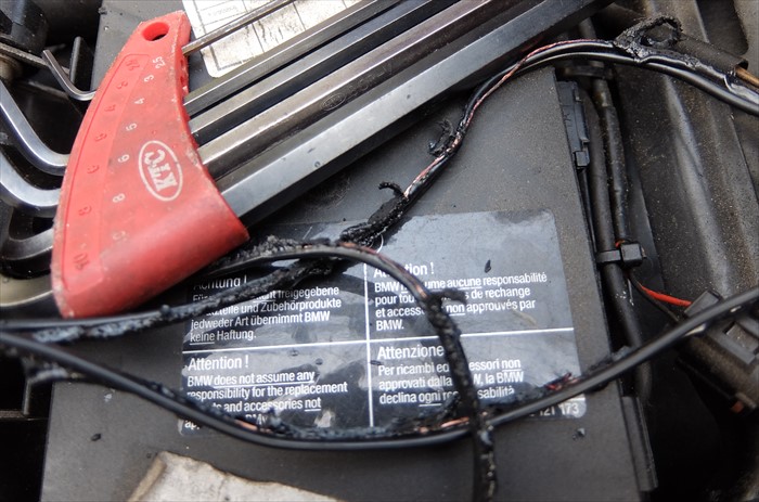シート下から煙がモウモウと!!!マジ大慌てでシートを空けると、充電器用のコードが…