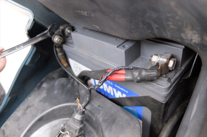 かえる助手の力も借りながら、何とかバッテリー端子にアクセスできるようになりました。