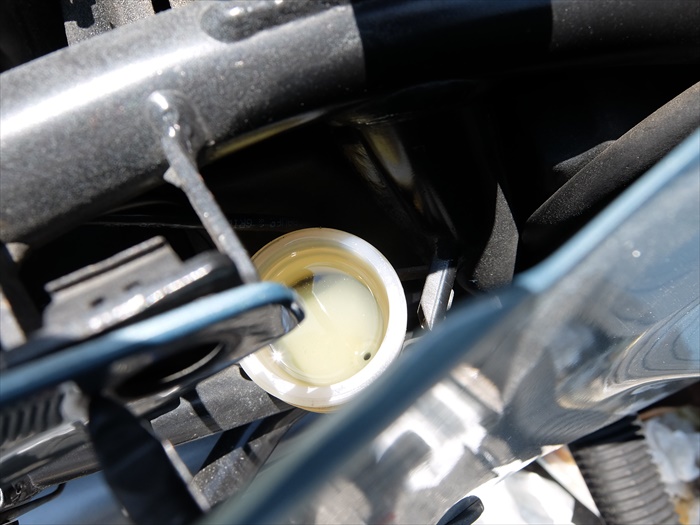 まずフィラー(新油の供給口)を開けてからドレンプラグを開く。鉄則ですね。