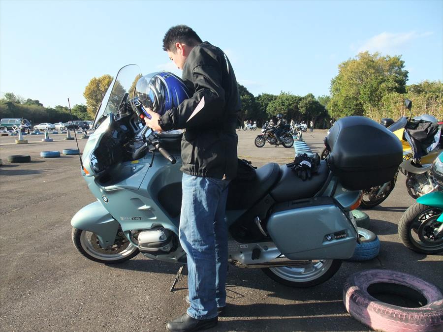 敷地内はバイク乗って移動できないので、クソ重いRTをヒーコラ押して駐輪場まで。