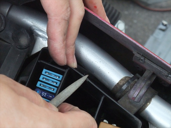 配線の「逃げ」を作るべく、ヒューズボックスをちょいとヤスリで削りました。