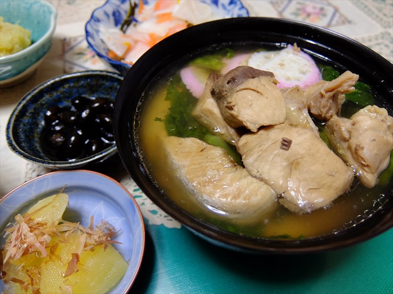 で、正月といえば雑煮ですね♪博多の雑煮はアゴ出汁とブリ・かつお菜が特徴。