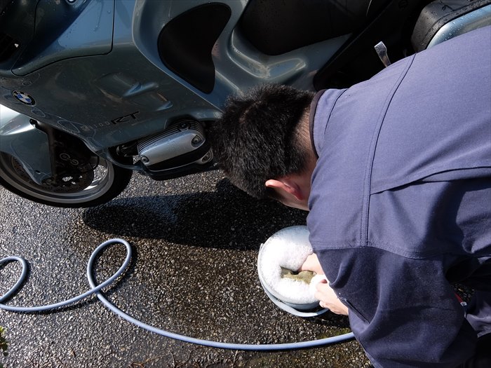 台所洗剤をバケツで泡だて、エンジンや足回りを洗っていきます。