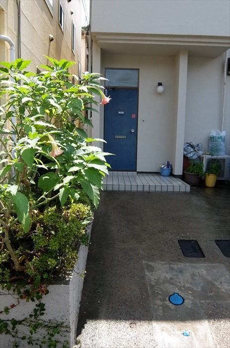 バイクは右側の大家さんの駐車スペースの境にある花壇にギリギリに停めないと玄関への導線が極端に狭くなるので、