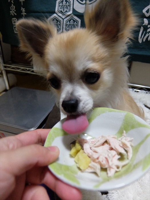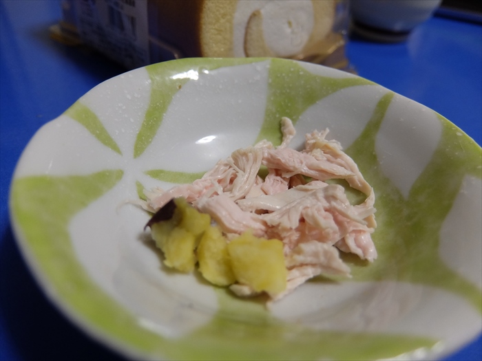 茹でささみと焼き芋で、ちょっとしたお祝いをしてあげました。